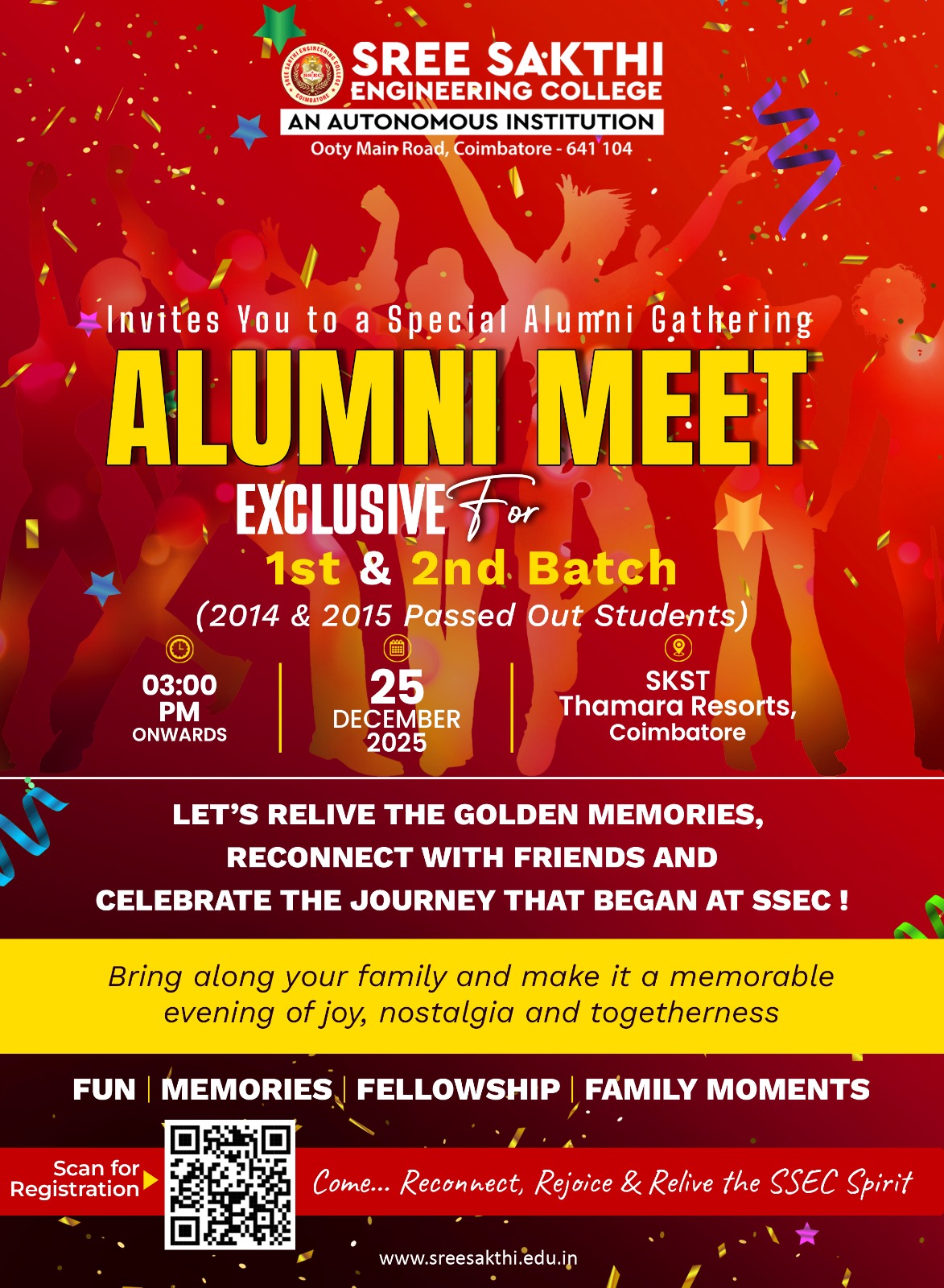 Sree Sakthi Engineering College (Autonomous) was established in the year 2010 by Shri. N. Dharmalingam, Chairman, and Dr. S. Karthikeyan, Correspondent of Sree Sakthi Charitable Trust, with a noble vision to provide value-based, high-quality technical education to aspiring students from both urban and rural backgrounds. From its humble beginnings, the institution has grown steadily into one of the most promising centers for engineering education in Tamil Nadu, known for academic rigor, innovation, and a deep commitment to excellence.